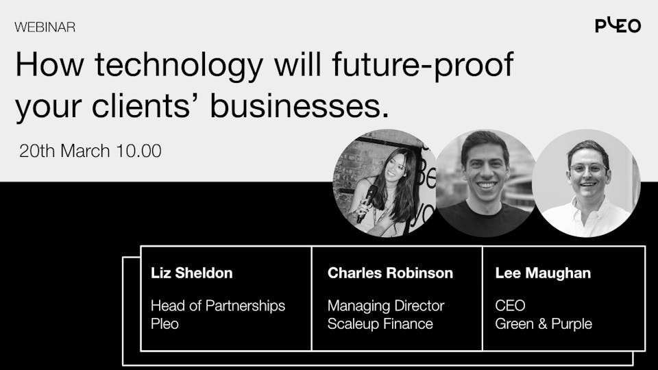 Revisit this session where Liz Sheldon, Head of Partnerships at Pleo, was joined by Pleo Partners Lee Maughan - CEO, Green & Purple and Charles Robinson - Managing Director, Scaleup Finance. They discussed the evolving accounting landscape and the power of recommending tech to help clients achieve sustainable business growth.